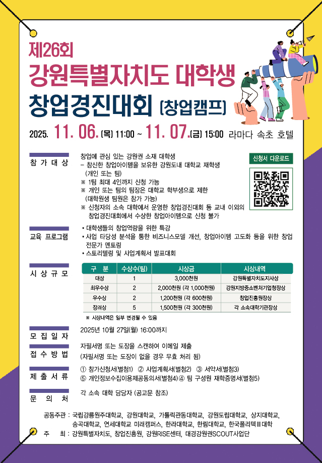 제 26회 강원특별자치도 대학생 창업경진대회(창업캠프)참가자 모집 (~10.27)